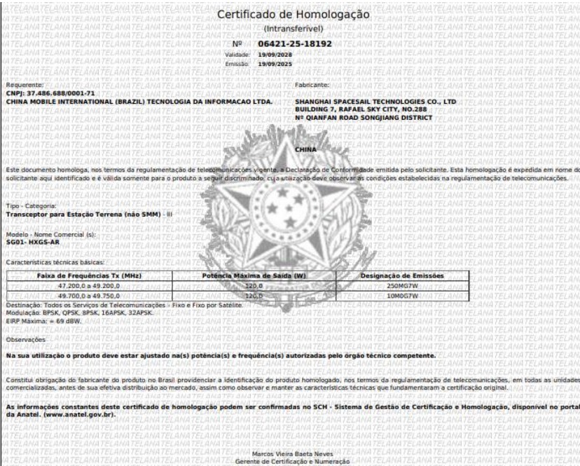 Certificado de Homologação n° 06421-25-18192 referente à homologação do Transceptor para Estação Terrena SG01-HXGS-AR